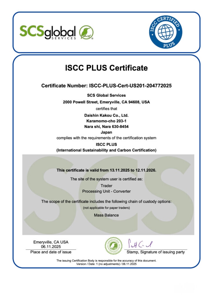 当社ダイシン化工株式会社は、2025年11月13日に国際認証制度のひとつである「ISCC PLUS認証」(※1)を更新いたしました。